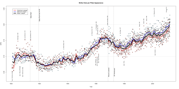 - These two small periods of rapid decline were both followed by long stretches of slowly increasing strikeout rates. Strikeout rates steadily climbed from about 1920 through the mid-1960s, and then again from 1980 to present.