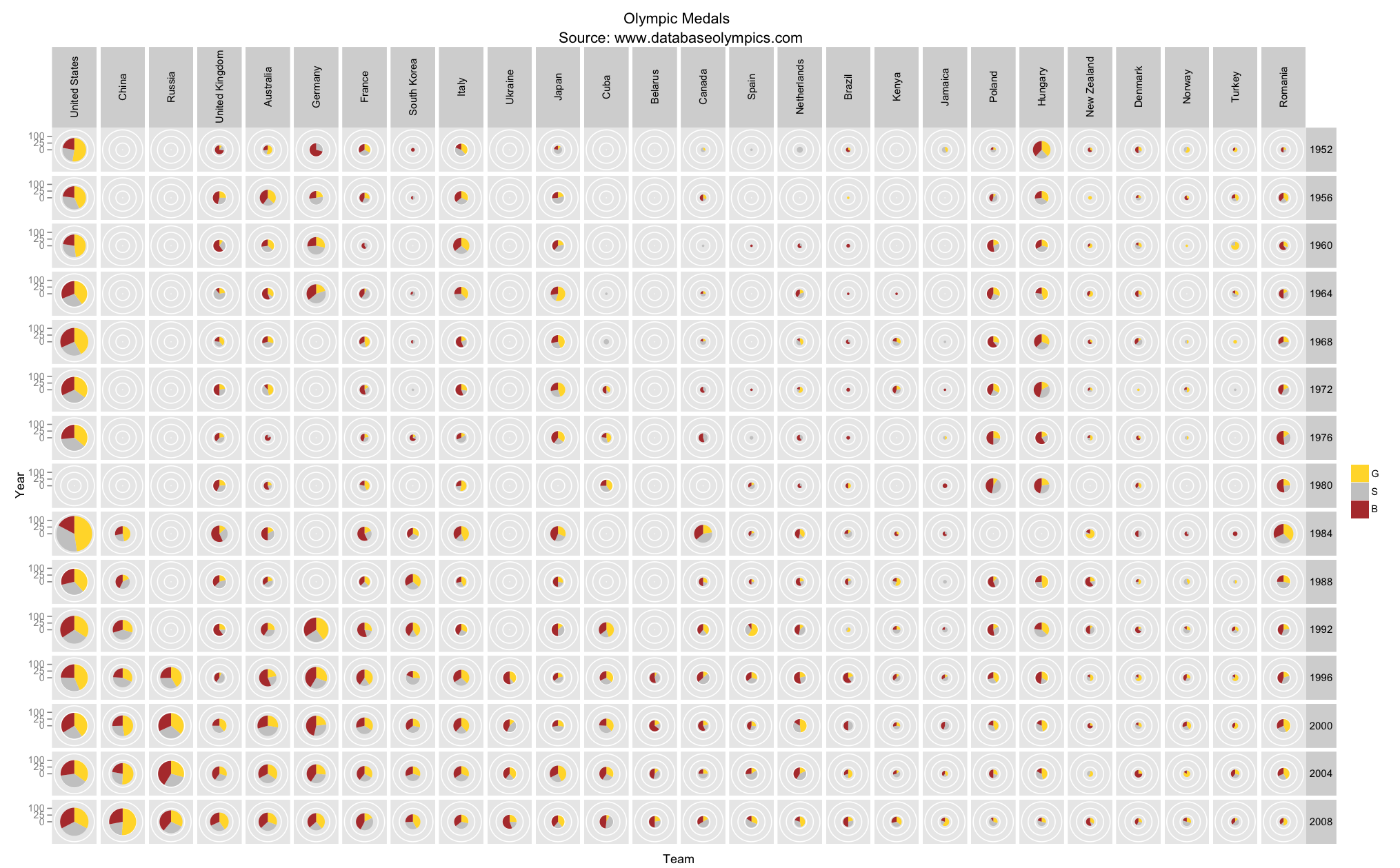 Below is a plot of the Olympic medals won by year for the top 26 countries (by medal count in the 2008 Olympics) for the years 1952 through 2008. The size of the pie chart is proportional to the number of medals won by a team on a square root scale, and each pie chart shows the break down of total medals by type (gold, silver, or bronze). So you can see, for instance, that in 2008 China won about 100 medals (in fact, it was exactly 100) and, it’s easy to see that over half of them were gold. You can also see that the United State won slightly more medals that China (110 to be exact), but the distribution of medals was nearly evenly distributed across the three types (36 gold, 38 silver, 36 bronze).