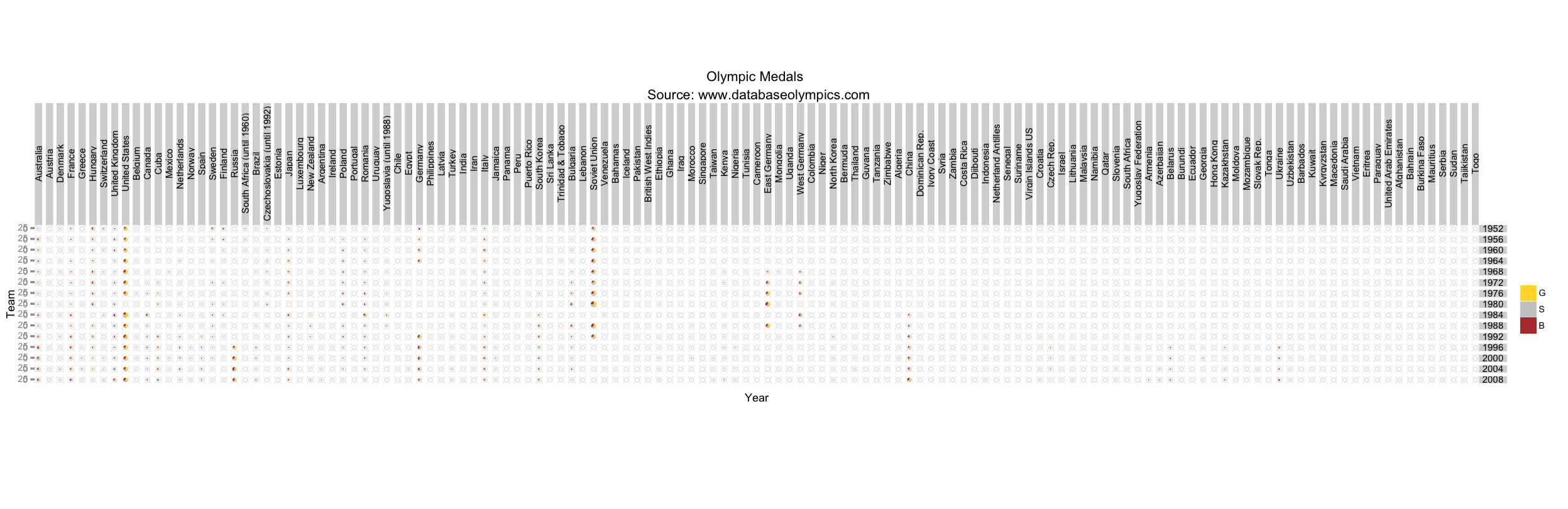 Here is a graph of the top 26 countries by medal count from the 2008 Olympics, across the years from 1896 through 2008.
