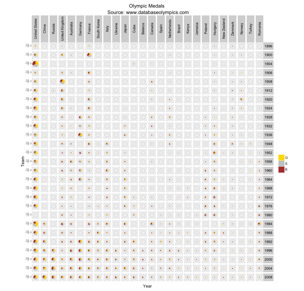 First off, for the R nerds out there, (If you don’t care about R, skip to the next paragraph) I’m quickly becoming a huge fan of ggplot2. Below is an example of combining a facet grid with pie charts using polar coordinates. Pretty cool. (I know most graphics people hate pie charts, but I think it works nicely, especially to display Olympic medal counts). My only question about ggplot2 is how can I color in the background of a plao without changing the pie chart. I’d like to highlight the plots for a country in years where they hosted the Olympics. I’ve tried geom_rect() with unlimited bounds, but this seems to have problems in polar coordinates. Then I started to try using some grobs commands, but they appear to be out of date. Any ggplot2 experts out there have any suggestions?