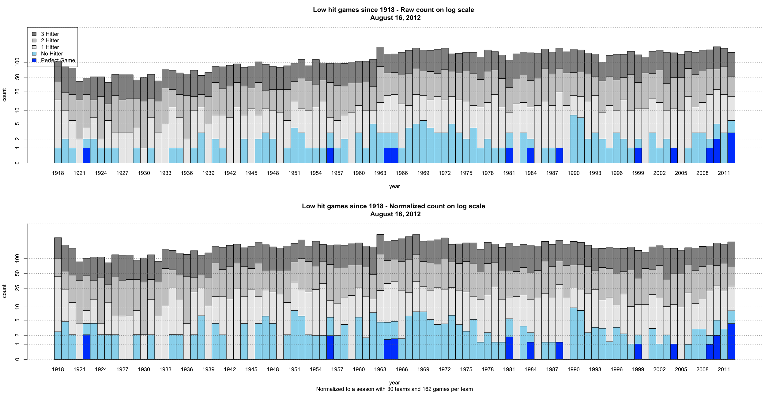 Felix Hernandez of the Seattle Mariners just threw the third perfect game of the season, so I figured it was a good time to update my low hit games graphs that I posted in June. So, here they are: