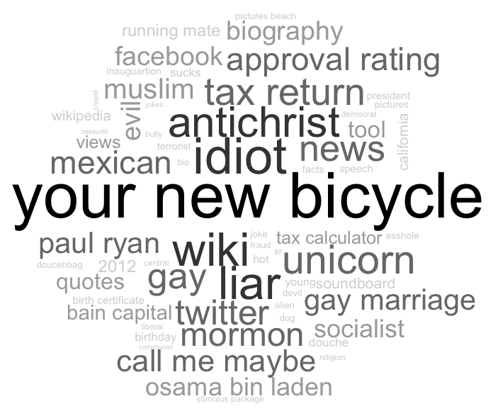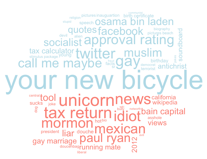 I’m using three search engines (Google, Bing, and Yahoo!) and two search terms for each candidate (Mitt Romney, Mitt Romney is, Barack Obama, Barack Obama is). I’m then weighting the terms from 10 to 1 for Google and Yahoo and 8 to 1 for Bing (as they only return 8 search terms), based on the order they appear in the auto-completes. For the first two word clouds, I’m additionally weighting the search engines with Google getting weight 11.7, Bing gets 2.7, and Yahoo gets 2.4. (These numbers are approximately the number, in billions, of searches performed on each site respectively in February 2012.)