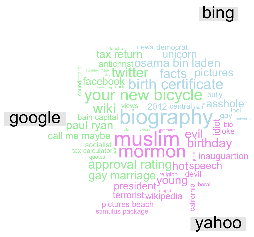 The final wordcloud of the trio breaks down the auto-complete terms by search engine. Note that, these words for this wordcloud are not weighted by search engine, but they are weighted by order within each search engine. I think it’s kind of interesting that, for Yahoo, the big words are religions: Muslim and Mormon. This makes me wonder if different search engines might predict in some way political affiliation, and, apparently, I’m not the only one who’s thought about this. Looks like a group called Engage has already looked into this and their results are summarized nicely in this graphic. According to them, Googlers tend to be more Democratic and Bingers (?) tend to be more Republican. (I don’t see Yahoo on their graphic, which I find odd.) Also, according to Alexa.com Bing users tend to be older than the average internet user, slightly more likely to have “some college” education, and slightly less likely to have a graduate degree. Google and Yahoo users tend to be very much the average internet user with the exception that they are much less likely to be over the age of 65.