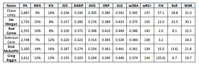 Even deeper, though, are his criteria to form this five man list: ages 26-29 seasons with a wRC+ of 130 or higher. I think it’s totally fair to say that Robinson Cano has been an elite secondbaseman. Over the time period Cameron is looking at, 2009 to 2013, Cano had the sixth best wRC+ in all of baseball (by the by, Ben Zobrist, incidentally toes the line as number two, following the 2012 AL MVP. Zobrist is criminally underrated.) My issues with the set though are a) Cano had his only below-average year as a major leaguer in 2008, the year before the cutoff and b) wRC+ of 130 is elite, but it’s also extremely exclusive. Additionally, based on Cameron’s criteria we have what I call the “Carew Issue” (it rhymes, which makes it fun. If you don’t find it fun to say “Carew Issue,” I feel like you need to lighten up.) Through age 29, his Rodness was indeed an other-worldly hitter as second basemen. But time played some jokes on Rod Carew; not only is he probably now best known as a line in an Adam Sandler novelty song, he also only played 30 innings at second in the remaining 8797.2 innings of his career. Biggio (whose name does NOT rhyme with “issue,” for the record) is a little more defensible, though he did play 3491 innings at catcher before he switched to second at age 26, he also played his age 37 and 38 seasons in the OF. The problem here is that, if we’re trying to test if second base causes inherent problems for the men who play it, shouldn’t we try to have only second basemen?