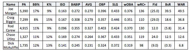 Well, let’s actually think about this. First look at that list of CanoComps™. Those are some not-too-shabby folks to hang around. I’d hang around with those guys, if they’d have me. I don’t know what we’d talk about, but we could eat ice cream (real ice cream, not analogue ice cream that is actually baseball writers). I could probably bait Joe into talking about that terrible book Billy Beane wrote. But here’s the thing: I expected more players with some other criteria to show up (in Cameron’s article, not with my second baseman caucus), but this was the whole list. Five dudes.