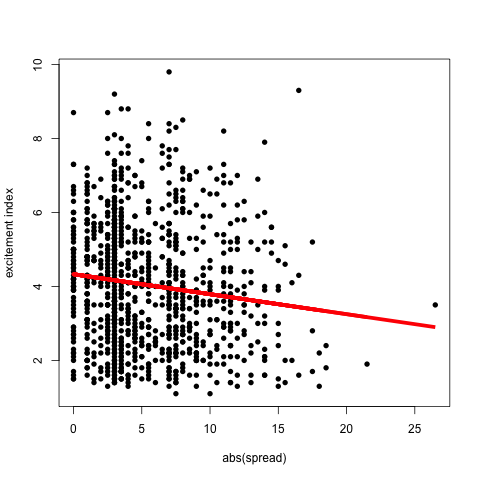 This means that for ever two point increase in spread, we lose, on average, about 1 point of excitement index. In other words with a spread of 0, the average predicted excitement index (EI) of a game is 4.33023. This is about the 60th percentile of all EIs from 2010-2013. A spread of 3 yields a predicted excitement index of 4.168 with is about the 55th percentile of all excitement indices. When the spread jumps to 7 points, the average excitement level is about 3.95 which is about the 51st percentile of EI.