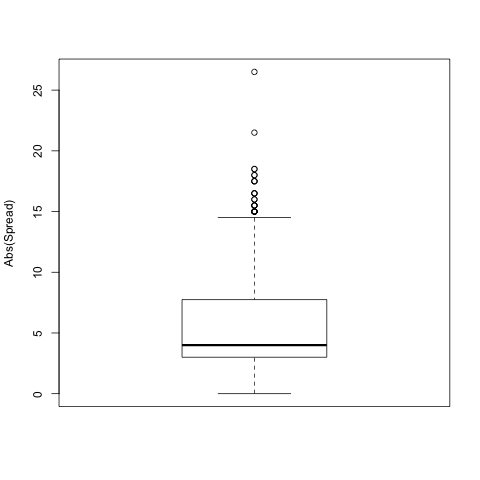 Looking at a summary of the absolute value of the spread over these 1024 games we find that the average spread is 5.44 points with a median of 4. The inner quartile range of spreads in from 3 to 7.625 and the minimum spread over this time was 0 with a maximum of 26.5(!).