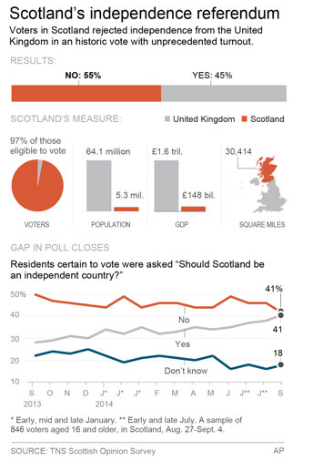 Finally, the pie chart.  This is a puzzle to me.  I’m not really sure what they are trying to say here.  Maybe I’m missing something, but it looks like what this is saying is that Scotland, who has a small fraction of the total population of the United Kingdom has a full 97% of the eligible voters and the United Kingdom has only 3%. That’s clearly not true.  So what is that pie chart trying to say exactly?  I really have no idea.  (Please let me know if you know what it is trying to say.  I really have no idea.)
