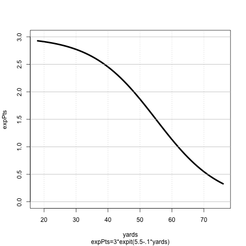 . This is a nice formula and implies that a 20 yard field goal will be made over 97% of the time and a 30 yard field goal will be converted 92.4%. 40 and 50 yard field goals are expected to be made about 81.8% and 62.2%, respectively. Under this model, at 55 yards, a field goal is exactly a coin flip and a 60 yard field goal has about a 37.8% chance to be made. By multiplying these probabilities by 3 (i.e. the value of a field goal), we can get the expected value of a an attempt. Below is a graph of distance of field goal versus the expected points of the attempt.