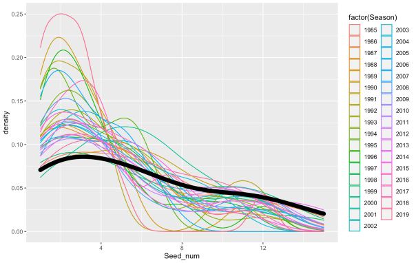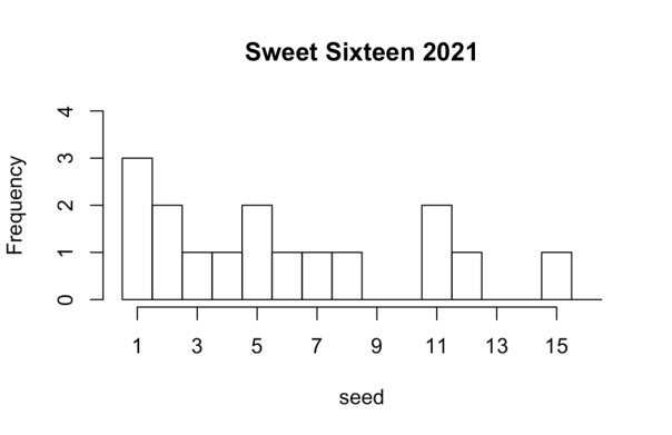 - Here is a density of the seeds in the Sweet 16. The black line is 2021. The flatter this estimate the more “madness”. A high peak on the left with a heavy right skew would indicate a very “chalky” year tournament.