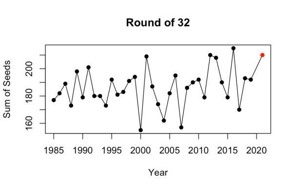 - The sum of the seeds in the Round of 32 was 210 this year. That is tied for the second highest ever (in 2016 the sum was 215 (TEN double digit seeds won their first round game!) and in 2012 the sum was 210).