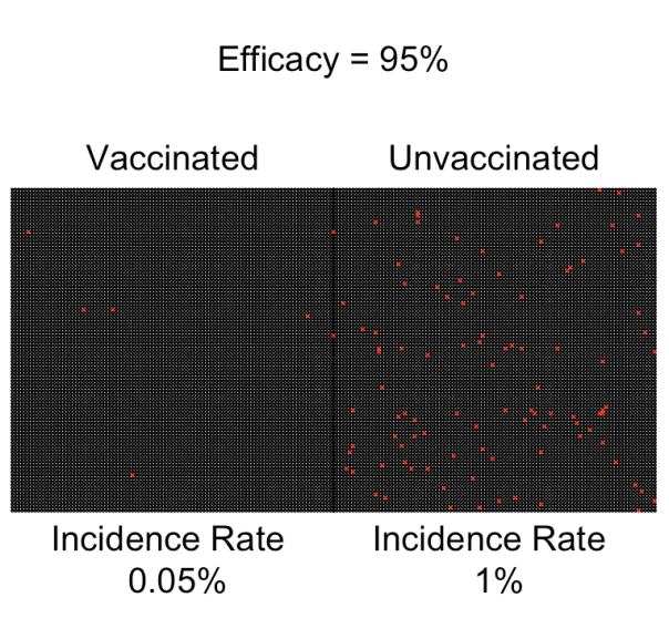So in this scenario the vaccine was “95% effective” while 2.5% of the vaccinated group developed the disease.