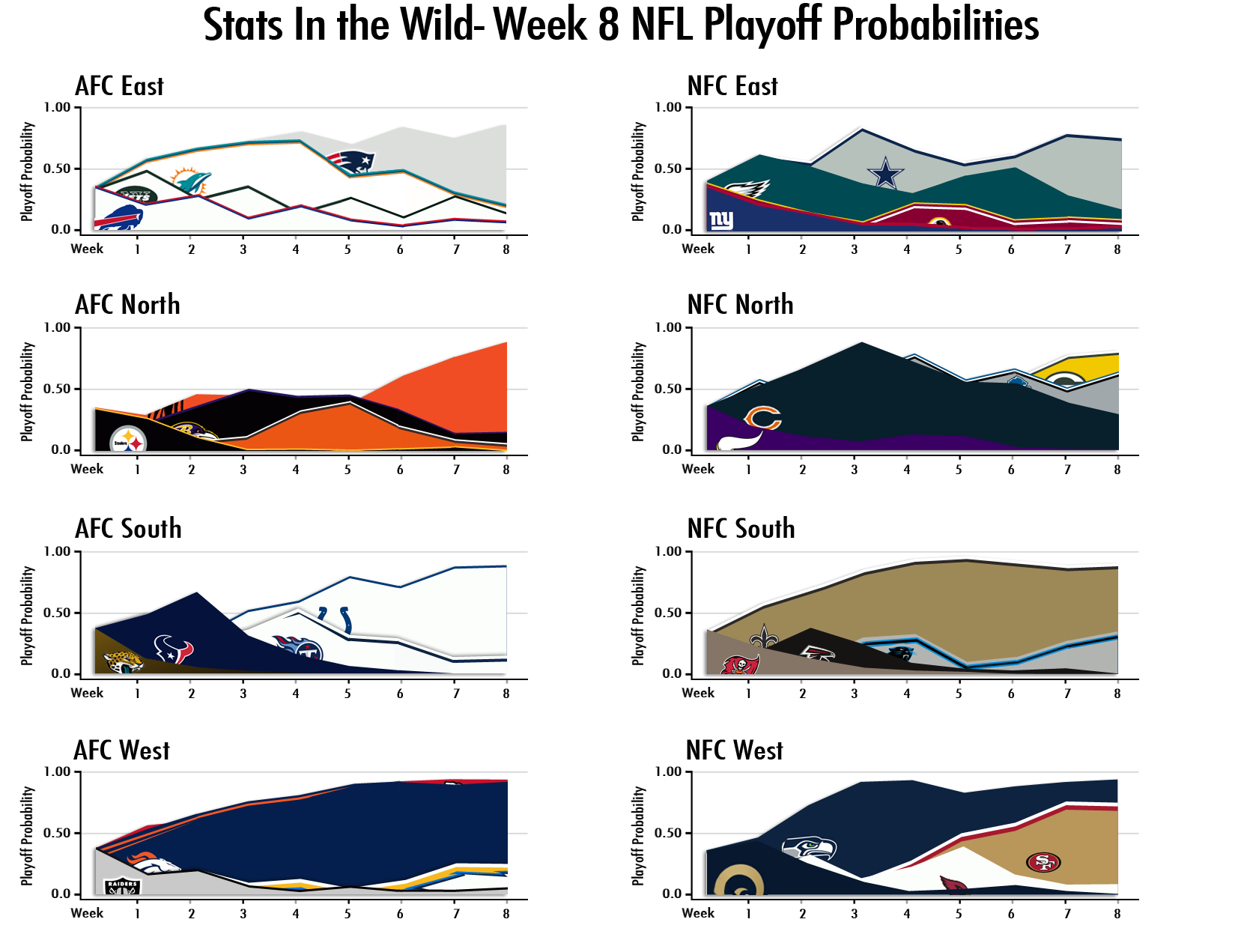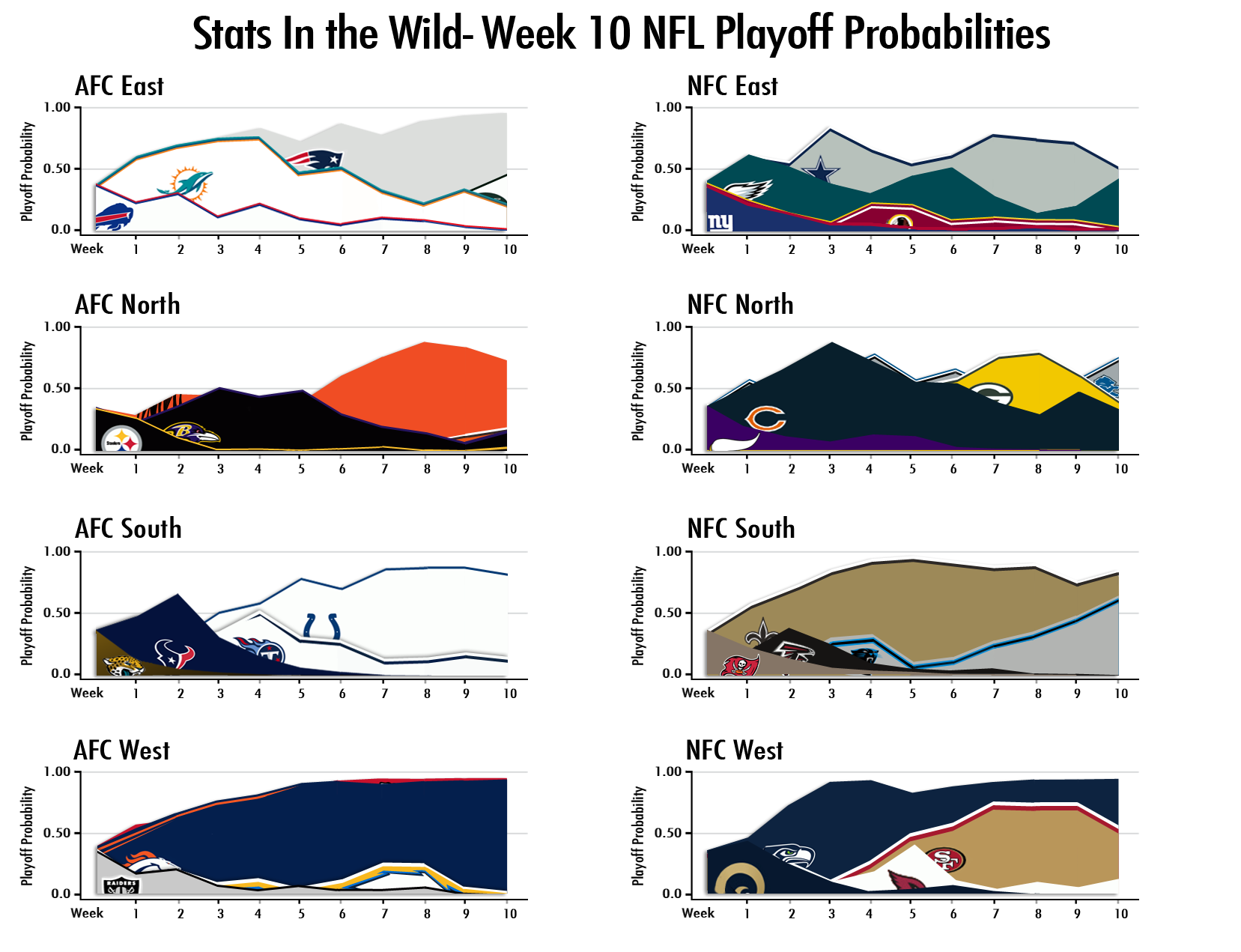 Unless something nutty happens in the next eight weeks, we’re looking at exactly the NFC North and MAYBE if Carolina puts together some big games (that’s with games against the Saints and Pats, who both are in but are also tough teams…). But wait! Count those AFC teams that are hovering near 1.00 and you only find five teams (KC is hiding there just behind the Broncos.) So who will get the sixth playoff spot for the AFC? While it looks like a race to the bottom for the AFC East teams that aren’t the Pats, the Fins along with the Chargers, Titans, Ravens and Browns all have punchers’ chances at that last spot. This Sunday’s Browns vs Ravens match up and the Week 11 SD vs Miami game could both loom large.