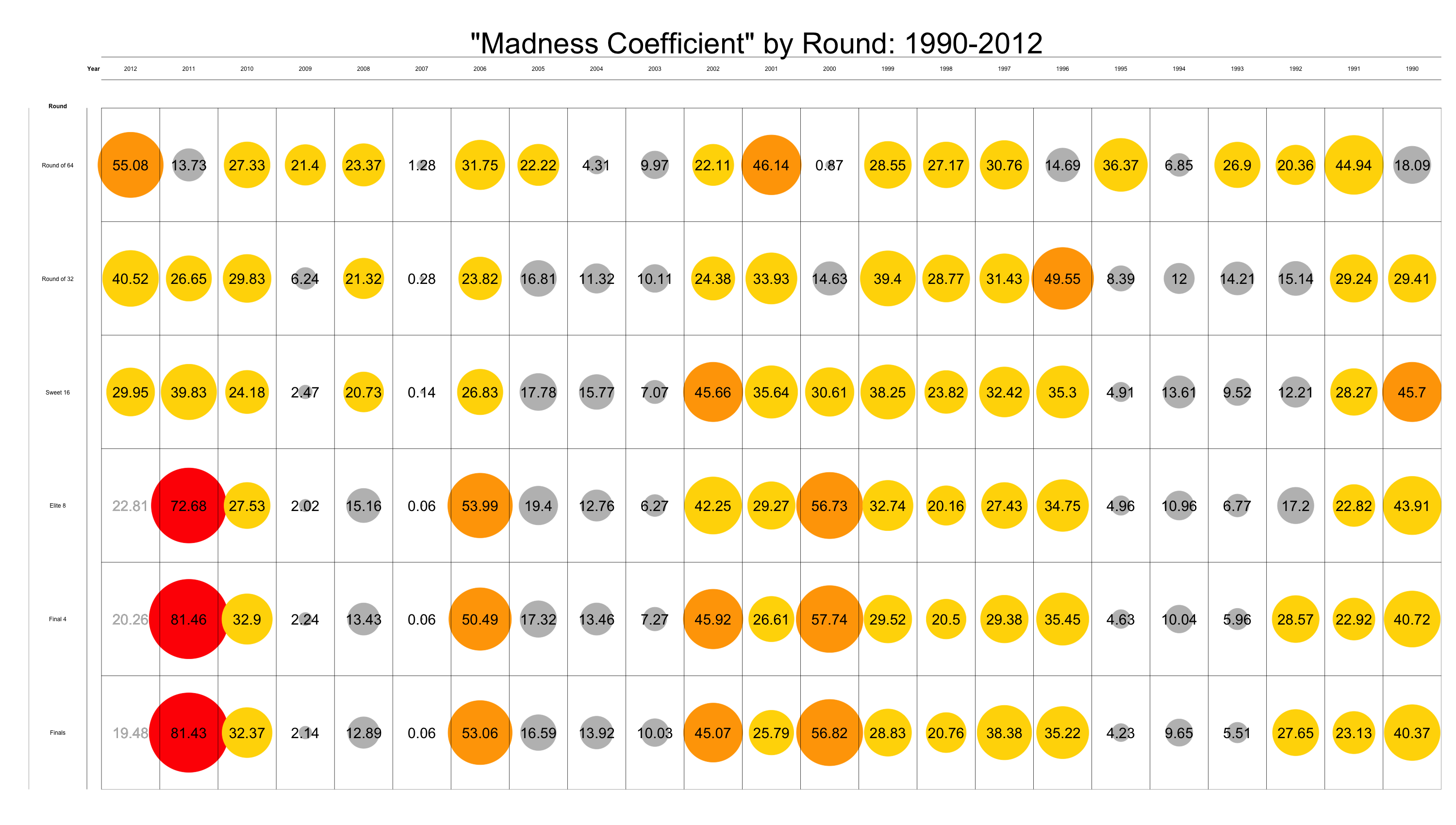 The first round of this NCAA tournament was the craziest dating back to 1990, and through two round (I don’t acknowledge the First Four as a round) this is the second craziest tournament over the same time period behind only 1996. 1996 featured a 12 seed in the sweet sixteen as well as a 1 seed knocked out in the round of 32. 2012 might be crazy, but all four number 1 seeds are still around.