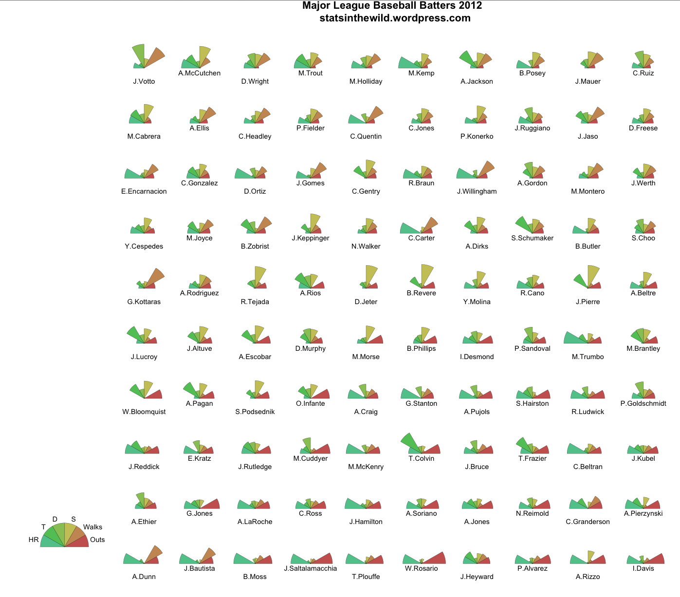 I’ve chosen 100 batters based on their wide range of hitting styles. In the first row, you’ll players who make outs at the lowest rates relative to other players. These include players like Joey Votto, Andrew McCutchen, David Wight, and Mike Trout. Further down, you’ll start to see players who you might describe as single’s hitters. These include players like Ruben Tejada, Derek jeter, B. Revere, and Juan Pierre. Finally, towards the bottom row, you’ll see the players who are primarily power hitters like Adam Dunn and Jose Bautista with large blue, for home run,s and orange, for walks, pie pieces, with significant red for outs. Other players on this row like Saltalamacchia, Plouffe, and Rosario have the large blue and significant red pieces, but they lack walks.