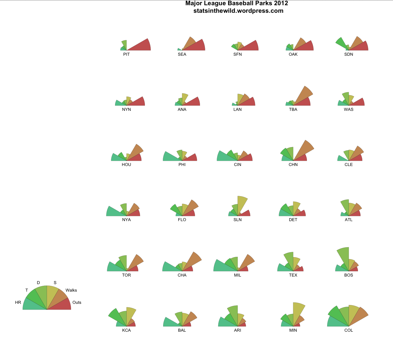 Here are some star plots for major league baseball batters, pitchers, and ball parks. The star plots represent the outcomes of a particular at bat for a hitter, a pitcher, or at a given ball park. For each plot, batter, pitcher, and ball park was varied, while the other two parameters were filled in with the average value. For instance, all batters outcomes are calculated as if they were facing J. Kinney at Wrigley Field; Pitchers data was calculated as if they were facing K. Medlen at Wrigley; and Park factors were calculated as the outcome of J. Kinney vs K. Medlen at different ball parks. The data use to calculate these were downloaded from baseball-reference.com and includes the results every single plate appearance so far this season (about 125,000 so far) and where the game was played. Six outcomes to an at bat were considered: out, walk, single, double, triple, and home run. The probability of each of these events was estimated creating a vectors of probabilities with six elements corresponding to each of the six outcome considered. I’ve chosen to display this data using the star plots below. The key to the star plot can be found in the lower left corner of each plot and displays the probabilities of each outcome relative to other batters. For instance, a large blue pie piece on the left indicates that batter’s plate appearance ends with a HR more often relative to other players. Likewise, a large red pie on the right indicates that the batter’s plate appearance ends in an out more often than other players.