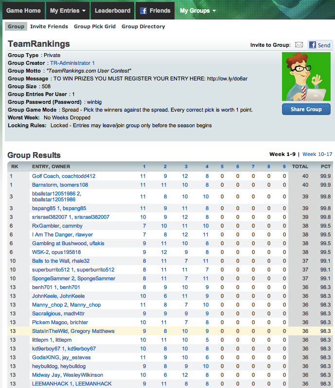 I’m currently sitting tied for 13th out of 508 participants in the TeamRankings NFL Pick ’em pool. Not a bad start.