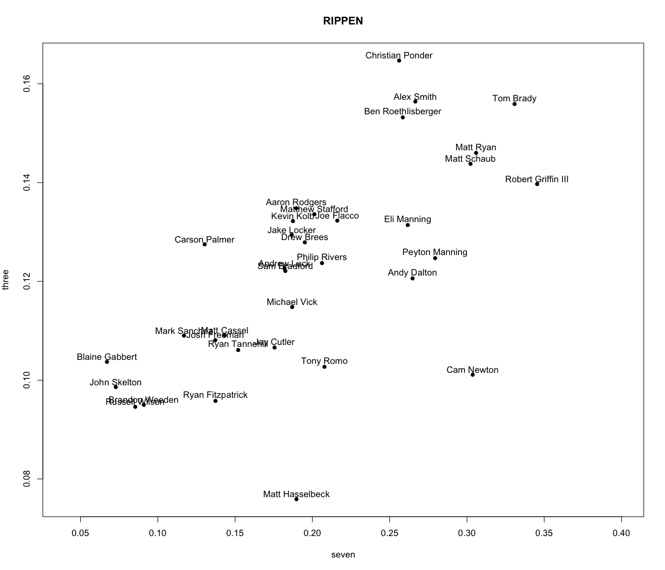 In a simulated world, how well would an offense perform if they started every drive from their 20 yard line and only ran passing plays with this quarterback’s stats. In this simulated world, a drive either ends with a touchdown (7 points), a field goal (3 points), or a turnover (0 points) (The defense never scores). RIPPEN is the expected number of points that an offense will score in 10 possessions (approximately one game) running only passing plays based on the specific quarterback’s statistics.