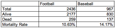 259 out of the 2436 qualifying football players was deceased according to http://www.pro-football-reference.com for a mortality rate of 10.63%. Among baseball players, 137 out of 967 were dead for a mortality rate of 14.17%. Both of these rates are lower than Barnwell’s, but are of similar relative magnitudes. Using a Fisher exact test, the null hypothesis of no association is rejected with a p-value of 0.004407, which is essentially identical to Barnwell’s p-value of 0.004. So there is a statistically significant difference between these groups. That’s a fact. But….