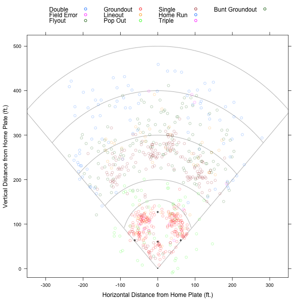 One nice aspect of the MLBAM data is that it contains an (x,y)-coordinate indicated the location of each batted ball hit into play. getData() returns a data.frame of class GameDayPlays. We have written plot.GameDayPlays() function for visualizing hit location data with a generic field overlaid.