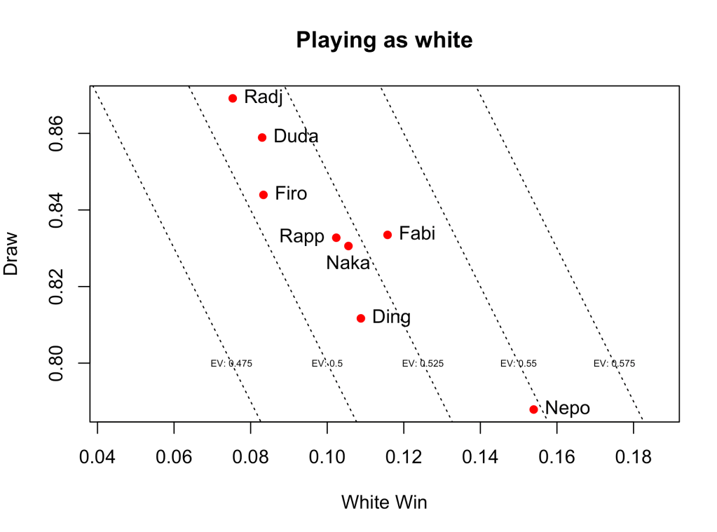 I’m also teaching a Bayesian class this summer, which gave me an excuse to use the data from the candidates tournament in a Bayesian example. So I showed the students a simple multinomial model for the three outcomes of (win, draw, loss). And we got to have a nice discussion about what our priors should be. I showed them that if we use a non-informative prior here and let the data dominate, we get kind of nonsense results because they’ve only played so few games in the candidates tournament. But we have a ton of prior knowledge! Since all these players qualified for this tournament, we are very confident that they are all very very good and also very very close in terms of skill. In the model that we set up, the strength coefficients are all relative to each other so we put priors on the betas with mean 0 and HIGH precision (low variance) since we have confidence that these players are all very similar to each other. We don’t want to let the result of a single game drastically change the regression coefficients. I’ve included the JAGS model below and the full code can be found here.