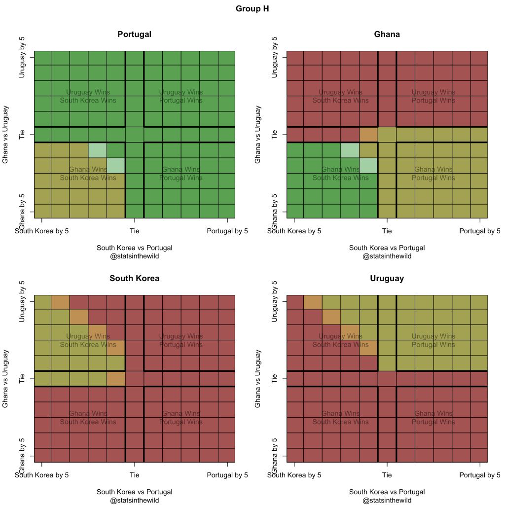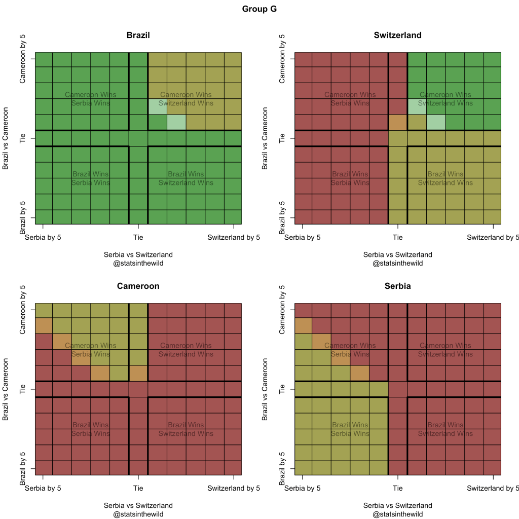 Hey, want to hear something weird? The advancement scenarios for Group G are exactly the same as the advancement scenarios for Group H. Just replace Brazil, Switzerland, Cameroon, and Serbia with Portugal, Ghana, South Korea, and Uruguay. That’s right. The points AND goal differentials are EXACTLY the same for Groups G and H (the third tie breaker, goals for, is different). Weird, right?