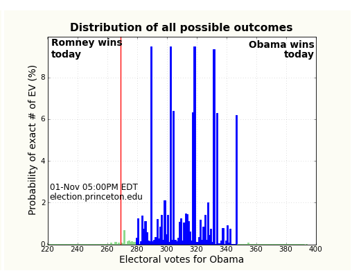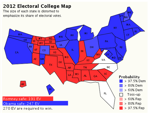 The article also pointed me to the Princeton Election Consortium, which is also fantastic. They have the probability of an Obama win at 99.0% and predict an electoral college win of 315-223. Below are some of the graphs they have produced about the election, I especially like the 2012 Electoral College Map with each state’s area displayed proportional to its electoral votes.