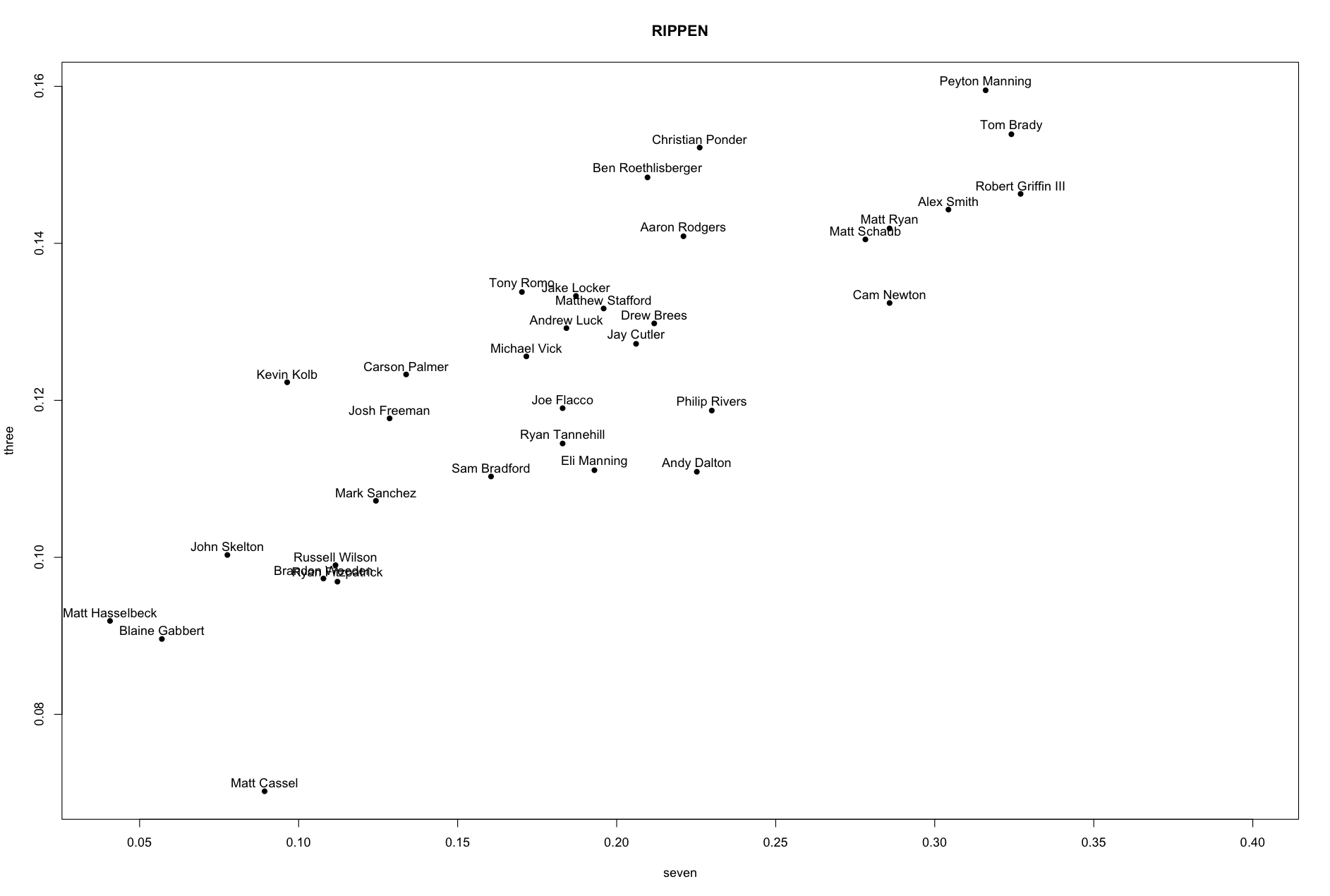 And finally, below is a plot of estimated outcome percentages that are used in calculating RIPPEN. If you look at Peyton Manning in the upper right corner of the plot you can see that starting from his own 20 yard line and only throwing passes in a simulated world, hell score a touchdown about 32% of the time and convert a field goal about 16% of the time. So he’d score on around 48% of drives. Compare this with Blaine Gabbert who will score a touchdown on about 6% of drives and get a filed goal about 9% of drives. This means that 85% of Gabbert drives, in the simulated RIPPEN world, end in either a punt, an interception, or a missed field goal.